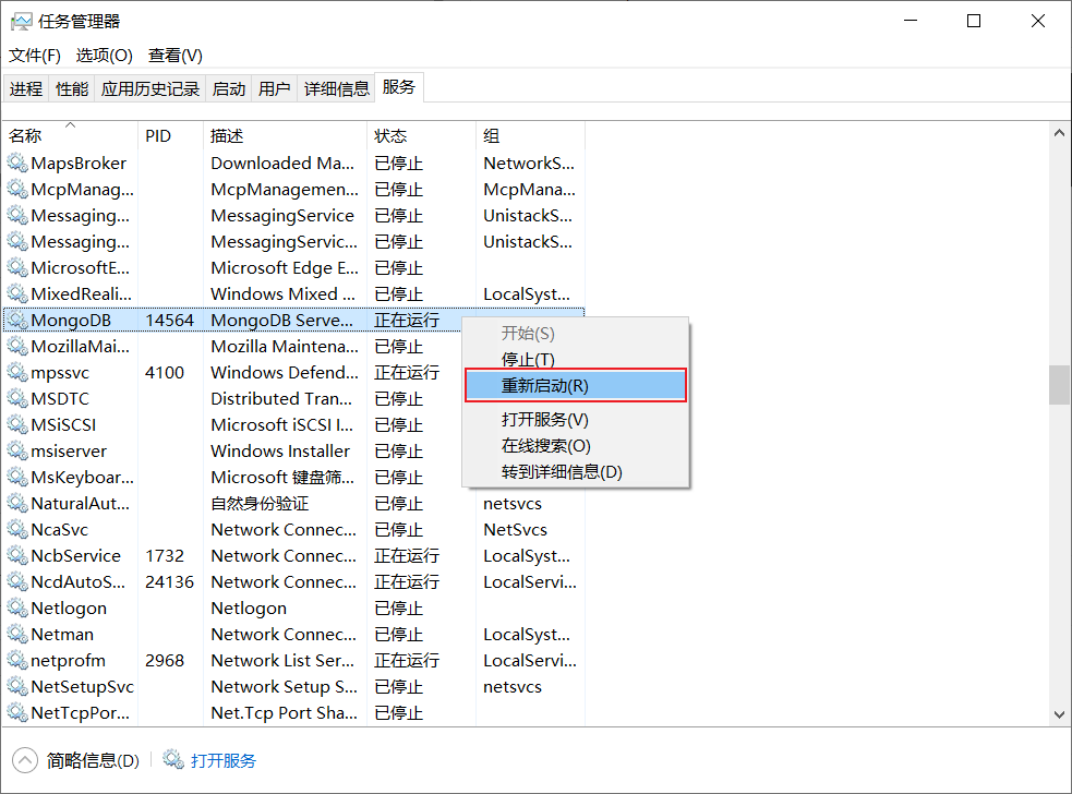 3.重启MongoDB服务;