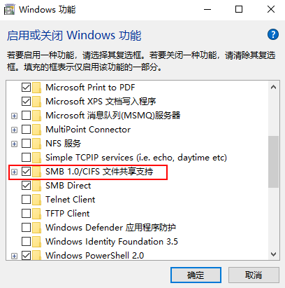四、勾选SMB1.0/CIFS 文件共享支持,然后确定、重启即可。