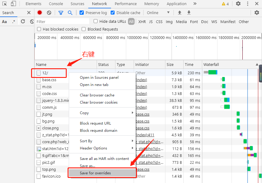 5.切换到Network面板,选中需要下载到本地的页面-->鼠标右键-->Save for overrides。