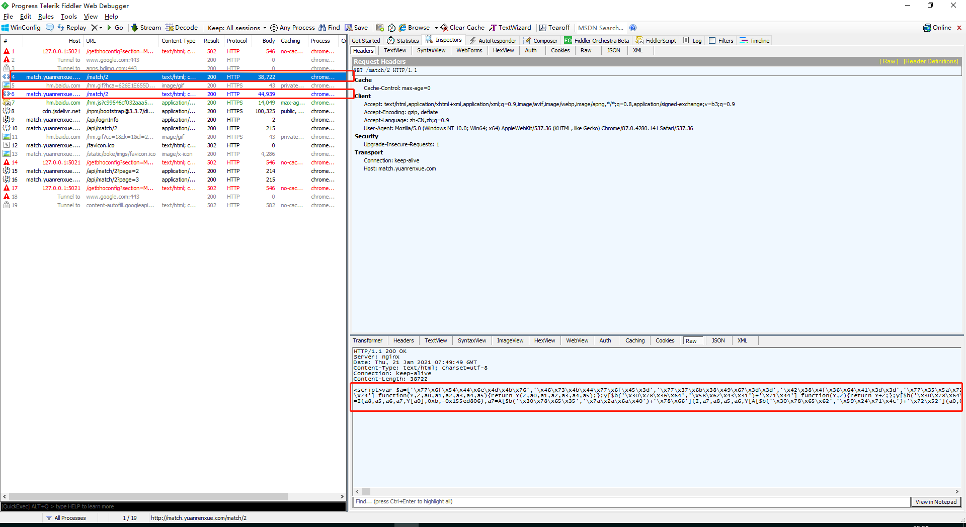 使用fiddler抓包看一下,可以发现在正确请求到数据的页面之前还发了一次请求; 点进去看一下,这个请求响应了一堆混淆过的JS代码。